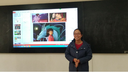 首先,从大家熟悉的动画电影《千与千寻(千と千尋の神隠し)》、《龙猫(となりのトトロ)》谈起动画大师宫崎骏(宮崎駿,みやざきはやお)的作品及其日语表达;在谈及日本动画导演和作家新海诚(新海誠,しんかいまこと)的最新力作《你的名字(君の名は)》时,播放了原声电影片头独白部分的录音,又将自己录制的独白进行展播,引来了大家的一阵掌声。刘老师建议大家在观赏外语影视作品时,勿忘语言的学习与积累,并鼓励大家勇于尝试外语配音等趣味性言语活动。然后,说起当前最受欢迎的日本推理小说家东野圭吾及其作品,并告诉大家相应的日语名称;在提及日本著名作家渡边淳一(渡辺淳一,わたなべじゅんいち)时,特别介绍了其随笔《钝感力(鈍感力,どんかんりょく)》的主旨及部分内容,并告诉大家“钝感力不仅限于精神方面,在身体方面也同样如是”,“应该以积极开朗、从容淡定的态度对待生活”。在一首经典的日文歌曲《四季之歌(四季の歌,しきのうた)》的欣赏过后,刘老师引导同学们用英语列举出一些大家熟悉的日本企业名称,并告诉大家其日语表达接近罗马字母的发音,如“丰田——Toyota——トヨタ”,以帮助记忆。之后,就日本的行政区划“1都(東京,Tokyo,とうきょう)1道(北海道,Hokkaido,ほっかいどう)2府(京都,Kyoto,きょうと・大阪,Osaka,おおさか)43县”进行介绍,并教大家用日语来说“都、道、府、县”及城市的名称。其后,推荐了日本艺人有村架纯(有村架純,ありむらかすみ)主演的励志电影《垫底辣妹(ビリギャル)》,鼓励大家积极应对每一次考试,并为即将迎来的大学英语四六级考试鼓气。接着,给大家展示并介绍了日本的和服、艺伎的装扮以及日本料理和相扑等,通过看图片来了解日本特色文化并学说日语。