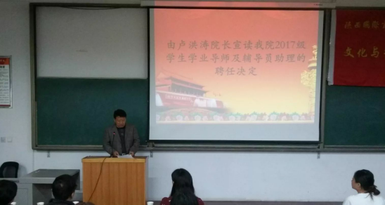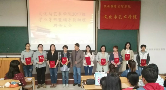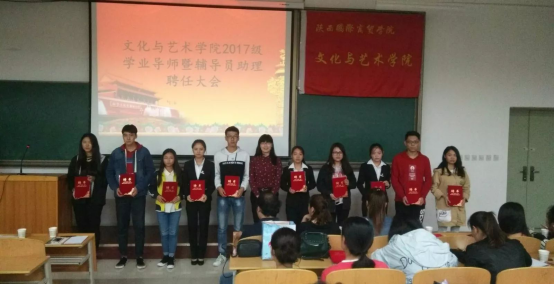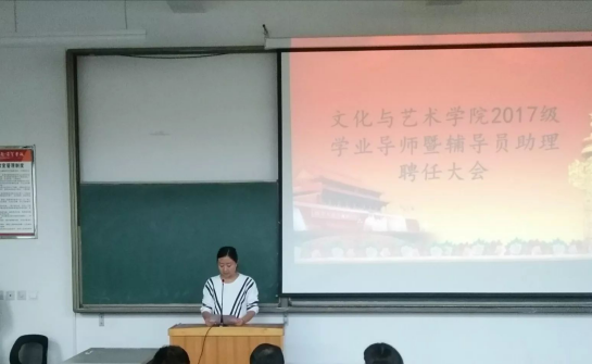 随着新生军训的结束,2017级同学们在学校的学习正式的开始了,为了让新生更快更好地适应新的学习生活,文化与艺术学院在2017年9月27日隆重召开了2017级新生学业导师、辅导员助理聘任大会。文化与艺术学院院长卢洪涛教授、党总支书记郭静书记、院长助理候庆斌老师、学生科科长邵星宇老师、各系系主任及导师、全体辅导员参加了此次会议,会议由邵星宇老师主持。